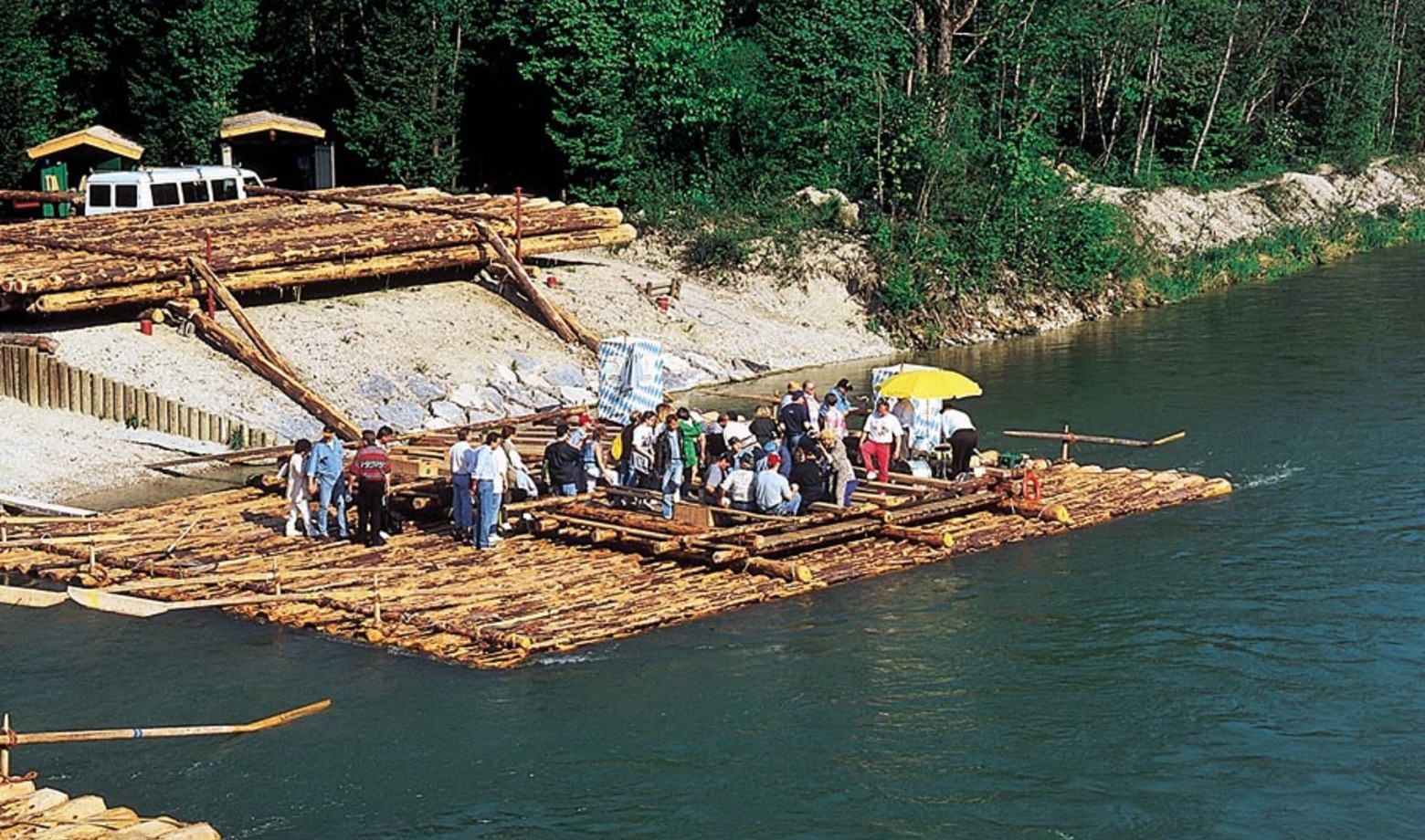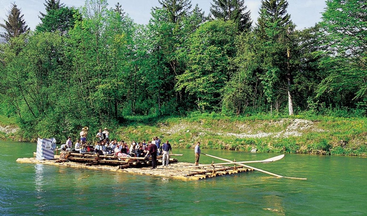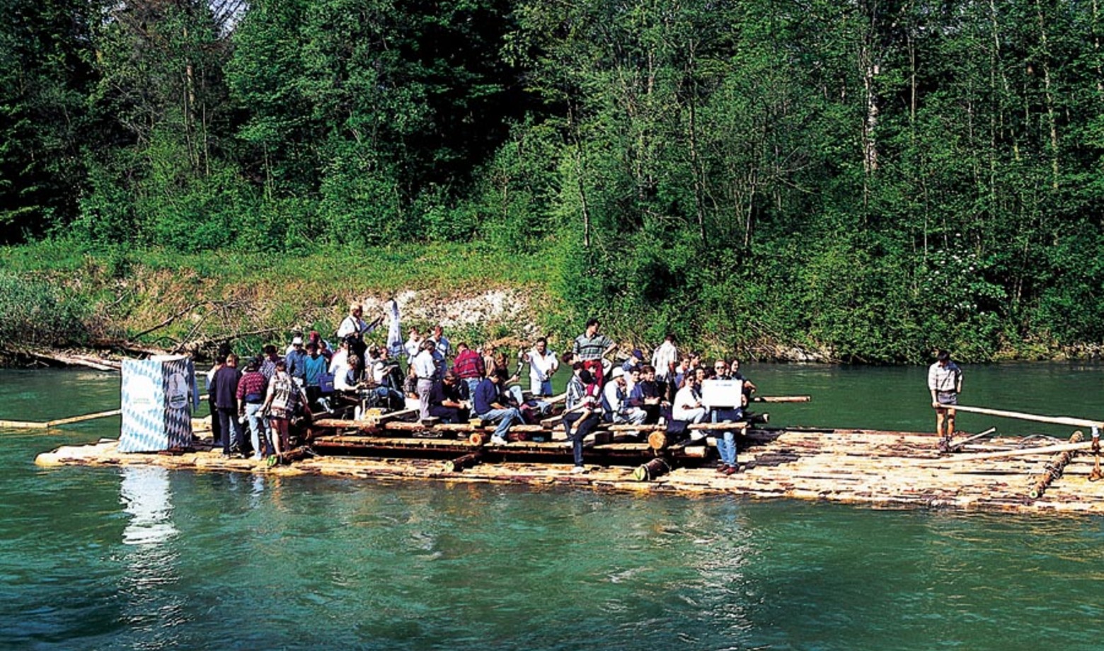 Auf einem großen Holzfloß gleiten Sie den Fluss entlang, begleitet von Live-Musik, deftiger Brotzeit und kühlen Getränken.